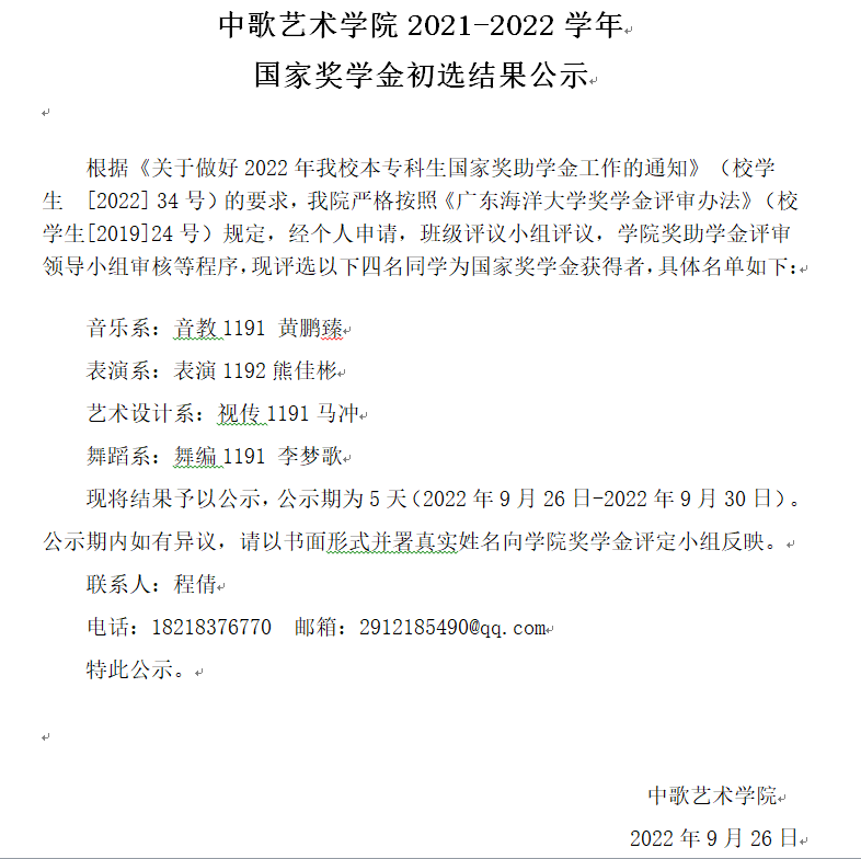 六合直播 2021-2022学年国家奖学金初选结果公示