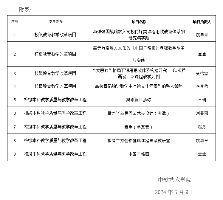 根据《关于开展2024年度校级本科教学质量与教学改革工程项目申报工作的通知》(校教务〔2024〕36号)、《关于组织申报2024年校级教育教学改革项目的通知》(校教务〔2024〕37号)的文件要求,六合直播 认真组织资格审核和评审推荐,经评审专家(院内3人,校外2人)集体讨论通过,同意向六合直播 推荐姚忠呈等共9个教师团队申报校级项目(详情见附表),现予公示。