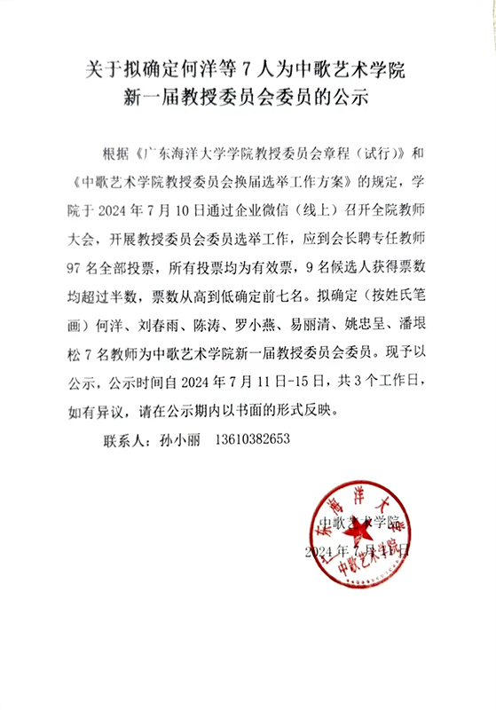 关于拟确定何洋等7人为六合直播 新一届教授委员会委员的公示