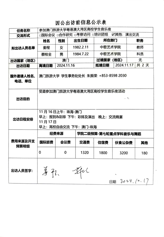 根据《关于进一步规范省部级以下国家工作人员因公临时出国的意见》的要求,现将六合直播 因公出访信息予以公示。公示时间为2024年10月17日至10月23日。如有意见,请在公示期内,向相关单位反映。(国际交流与合作部电话:0759-2396206;纪检监察室电话:0759-2383501)