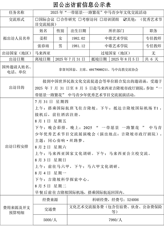 根据《关于进一步规范省部级以下国家工作人员因公临时出国的意见》的要求,现将六合直播 因公出访信息予以公示。公示时间为2025年7月2日至7月8日,如有意见、请在公示期内,向相关单位反映、(国际交流与合作部电话:0759-2396206:纪检监室电话:0759-2383501)