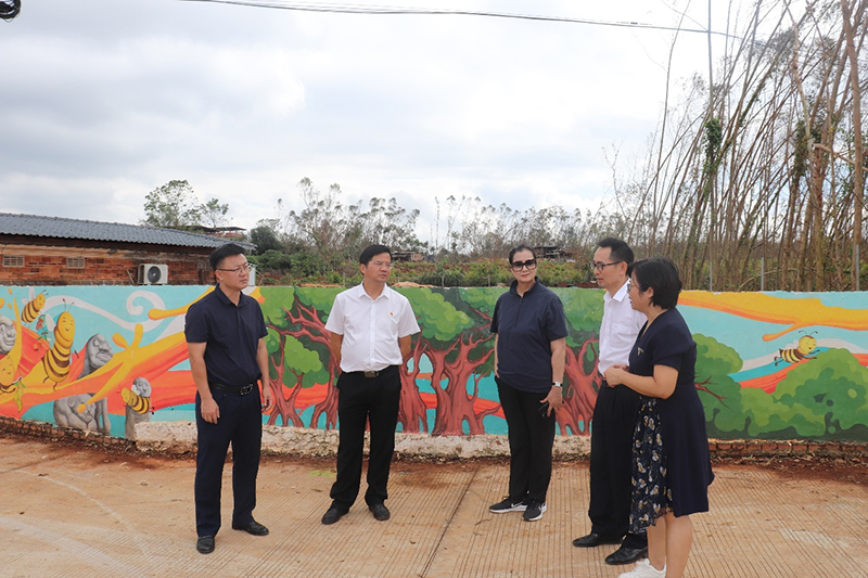 然后,一行到达项目组负责的墙绘区,一片鲜艳夺目的色彩,精描细绘的充满现代机械风的蜜蜂、栩栩如生的雷州特色瓜果、榕树,雷州石狗墙画赫然映入眼帘,墙绘内容充分体现了镇村特色,表达了乡村人勤劳进取的蜜蜂精神。