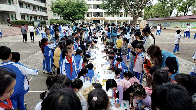 老师的悉心指导下现场书写绘制40米长的书法绘画长卷,学生们用色大胆,笔触自由,把心中的蔚蓝海洋与红树林的景象通过一幅幅作品展现出他们对大自然的热爱和对美好未来的憧憬。