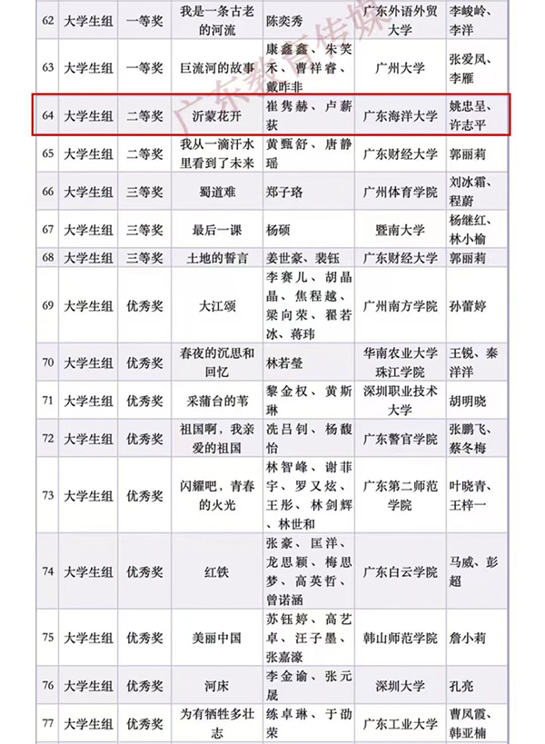 教师姚忠呈指导学生的诵读作品《沂蒙花开》脱颖而出,荣获全国大学生组二等奖。