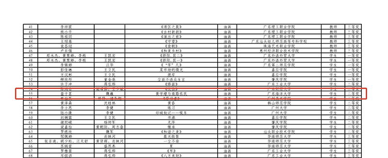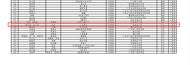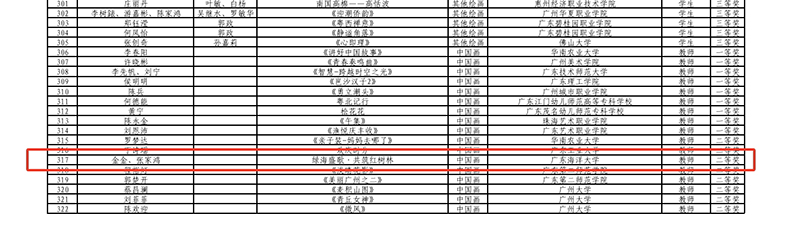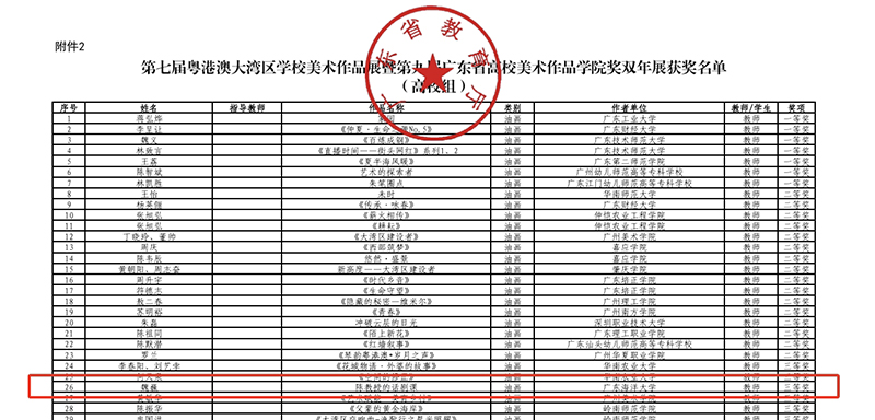奖双年展获奖名单正式公布。我院艺术设计系师生在此次作品展中表现出色,金金老师中国画作品《绿海盛歌·共筑红树林》荣获教师组二等奖,魏巍老师油画作品《陈教授的话剧课》教师组三等奖;谢志豪、盘子茗同学中国画作品《工业港口》获学生组一等奖,盘子茗同学油画作品《黄学增与南路农民》获学生组二等奖,为六合直播