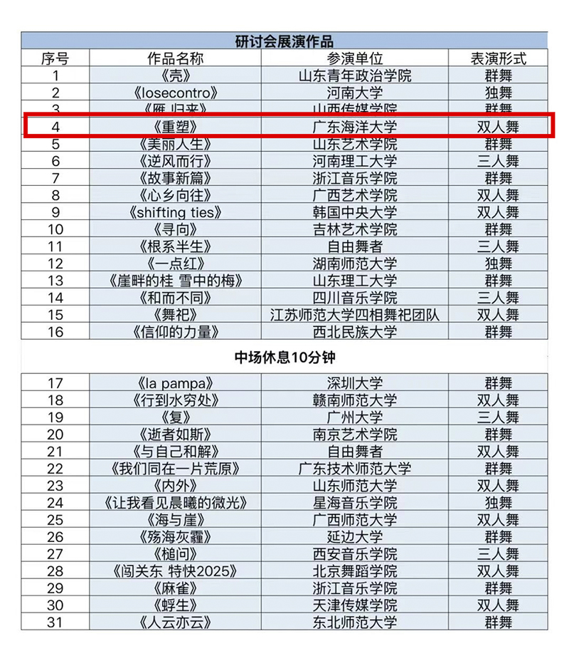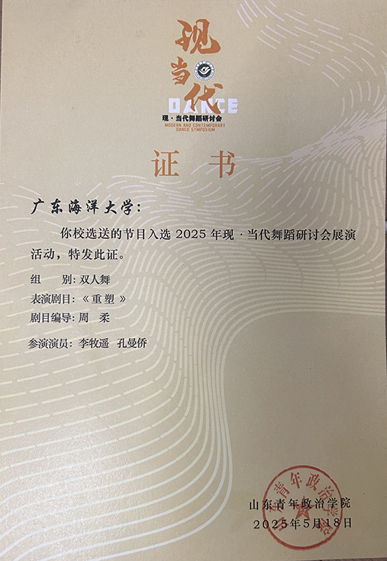 舞蹈系共有4部作品成功入围中国舞蹈家协会主办的“2025中国顶尖舞者成长计划广东分区推选”比赛,分别是舞蹈系沈玥老师报送的《苔花》,李梦依老师报送的《梦.傩灵》、《丝路.画卷》、《海姑娘》。